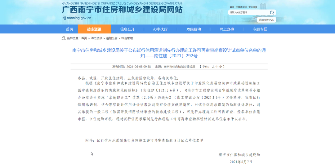 6月8日,南宁市住房和城乡建设局发布《关于公布试行信用承诺制先行办理施工许可再审查勘察设计试点单位名单的通知》(南住建〔2021〕292号)。